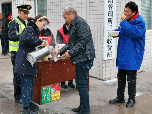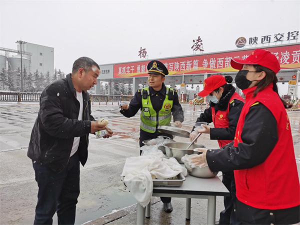2月21日,受降雪天氣影響,部分貨車滯留在楊凌收費站,冰天雪地,司機們無法解決就餐問題,西寶分公司楊凌收費站員工用熱情的微笑和貼心的服務,為滯留司乘提供了熱氣騰騰的饅頭、雞蛋和牛奶,讓司乘人員在匆匆旅途中感受到一份來自交通人的溫暖!(薛榮)