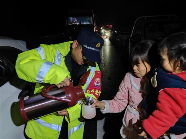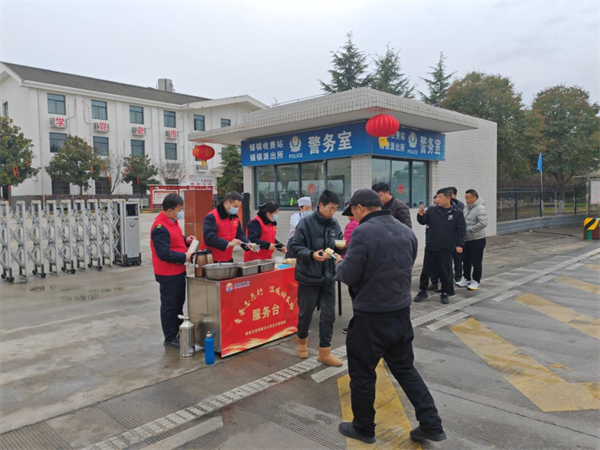 省路政執(zhí)法總隊第十支隊五大隊在營盤收費站外開展志愿者送溫暖行動,執(zhí)法人員為滯留旅客提供熱水,雞蛋,香腸,饅頭等食物,在嚴寒惡劣天氣為廣大群眾送上貼心溫暖。(王合歡)