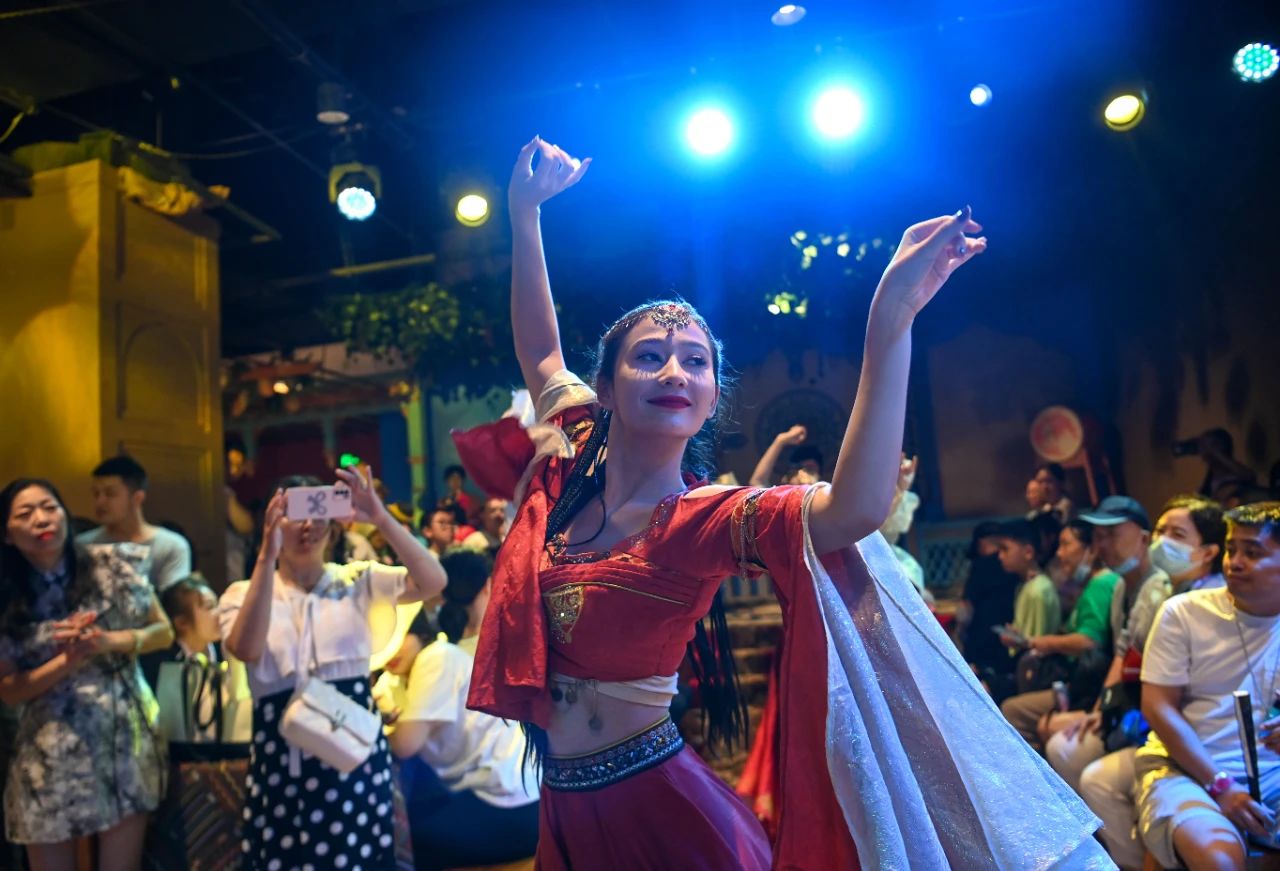 游客在長安十二時(shí)辰主題街區(qū)觀看唐風(fēng)演藝《胡姬酒肆》鄒競一 攝