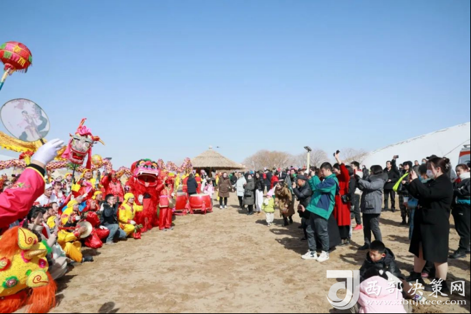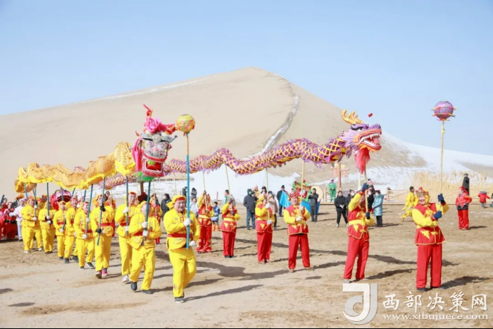 雪后的沙山與熱鬧非凡的社火表演,交織出一幅令人心花怒放的秀麗畫(huà)卷,游人近距離觀看社火表演,鉆龍、合影,祈福納祥,眾人歡聲笑語(yǔ)不斷,在社火中感受中國(guó)傳統(tǒng)節(jié)日獨(dú)有的民俗魅力,盡享年味敦煌。
