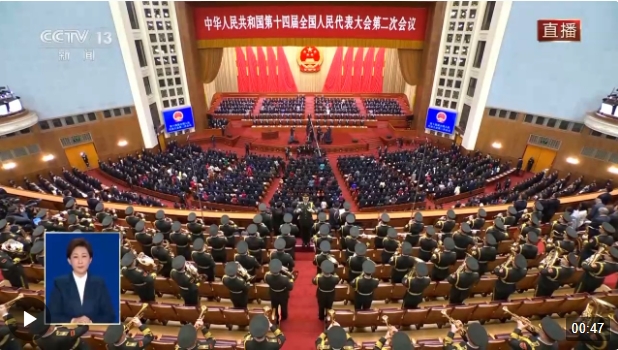 3月5日上午9時,十四屆全國人大二次會議在人民大會堂開幕,全體起立,高唱中華人民共和國國歌。