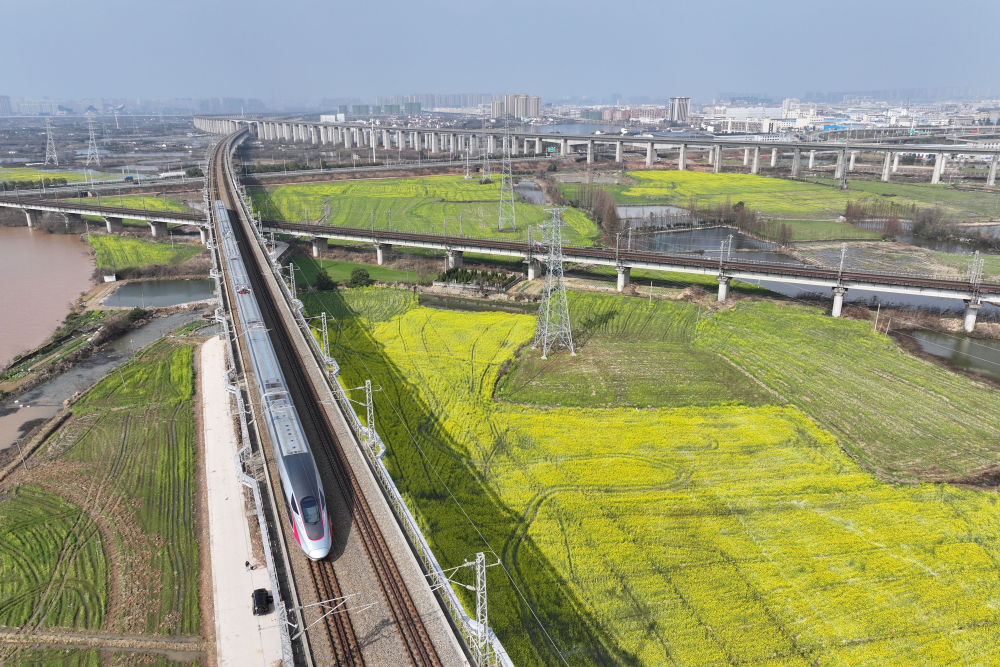 2024年3月2日,一輛高鐵列車從江西省南昌市南昌縣一處油菜花田旁駛過(無(wú)人機(jī)照片)。新華社記者 金良快 攝