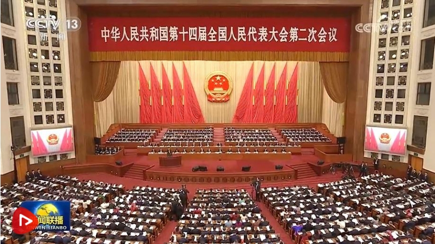 上午9時,趙樂際宣布:中華人民共和國第十四屆全國人民代表大會第二次會議開幕。會場全體起立,高唱國歌。