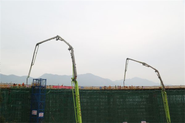 長(zhǎng)慶互通B匝道橋上部結(jié)構(gòu)為鋼筋混凝土連續(xù)箱梁,長(zhǎng)約100米,混凝土體積705立方米,采用盤(pán)扣式滿堂支架現(xiàn)澆法施工。為保障混凝土澆筑安全和質(zhì)量,項(xiàng)目部主要管理人員現(xiàn)場(chǎng)帶班,旁站監(jiān)理工程師現(xiàn)場(chǎng)履職,并配置46米混凝土泵車2臺(tái),混凝土攪拌運(yùn)輸車8臺(tái)。