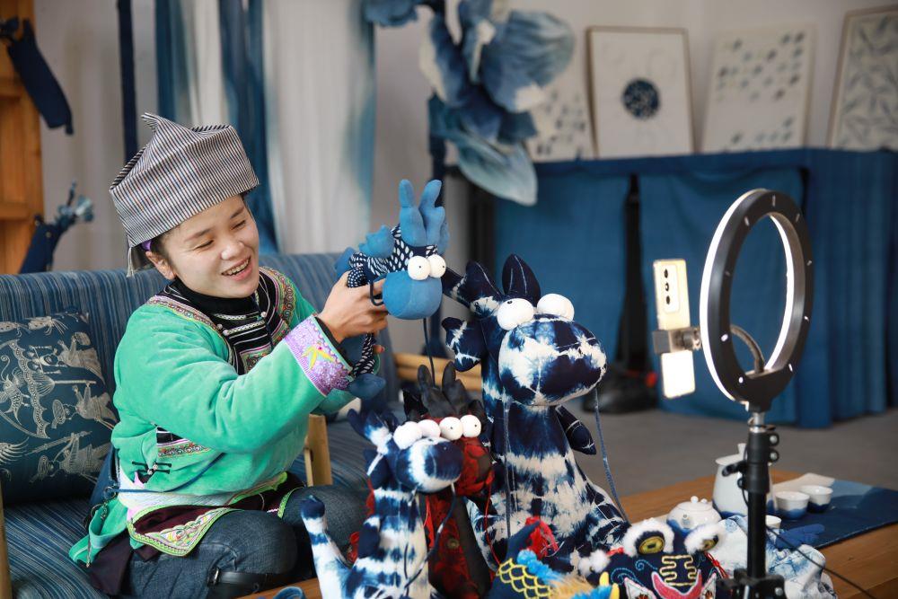 △2024年1月30日,貴州黔東南州榕江縣青于藍(lán)藍(lán)染藝術(shù)中心內(nèi),繡娘在直播帶貨。