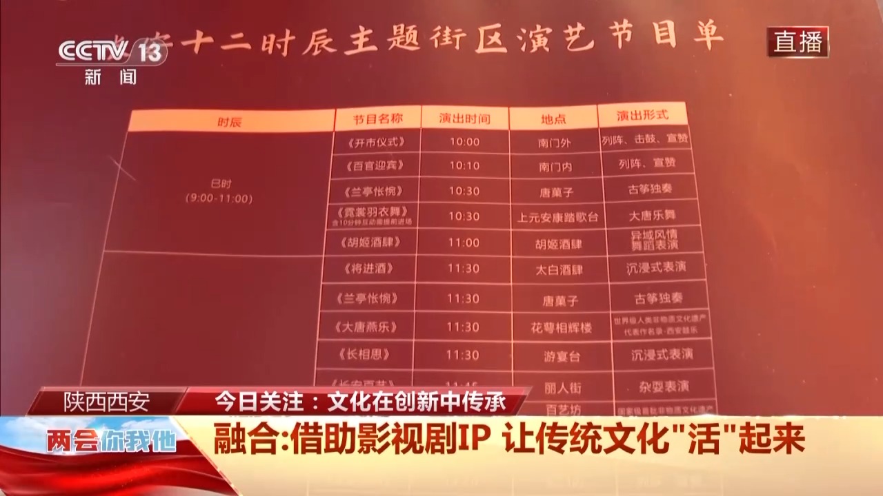 除了道具,這樣的一個(gè)主題街區(qū),小型互動(dòng)表演遍布,這個(gè)節(jié)目單從早上10時(shí)的開市儀式一直到晚上10時(shí)的互動(dòng)演繹,全天有70多場演出,旺季最多的時(shí)候有上百場演出。很多都是互動(dòng)式的表演,比如太白酒肆里,李白的《將進(jìn)酒》一出,總會(huì)出現(xiàn)現(xiàn)場齊誦的熱烈場面。這個(gè)春天,五湖四海游客齊誦唐詩的場景,已經(jīng)成為西安的一道新風(fēng)景。
