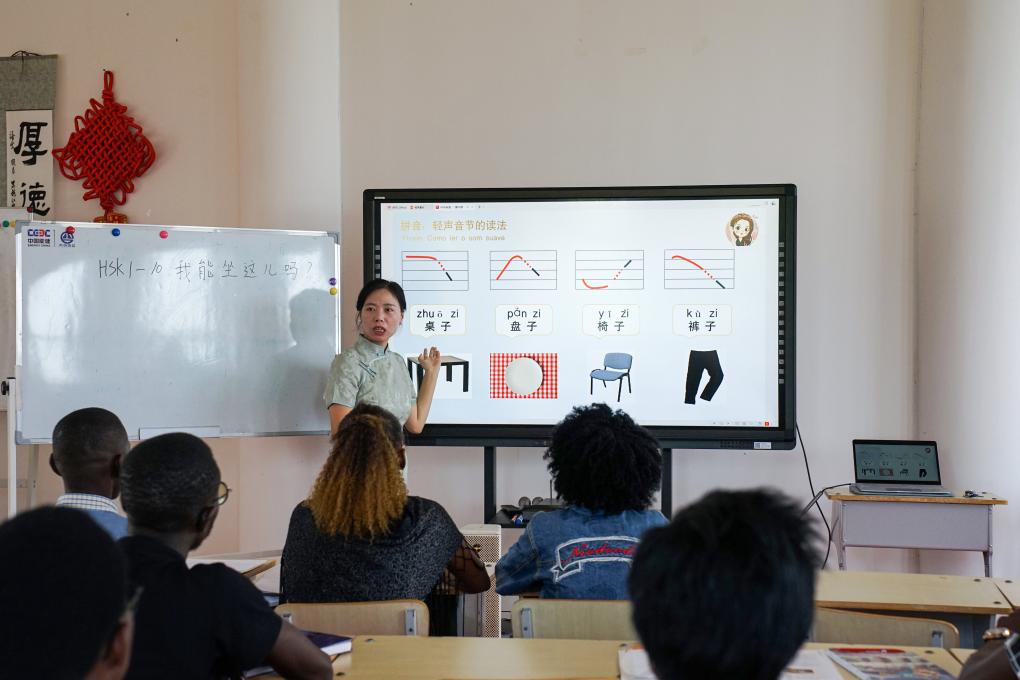 在安哥拉首都羅安達,內(nèi)圖大學孔子學院教師正為學生們講授中文。
