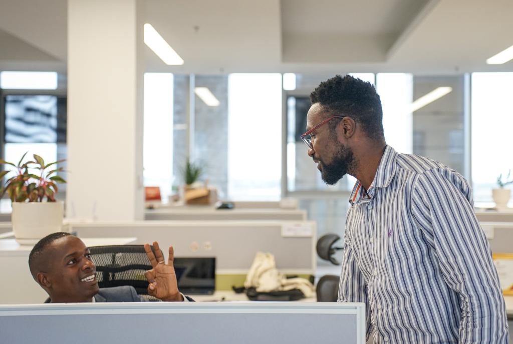 在安哥拉首都羅安達華為安哥拉科技園區(qū),路易斯·埃里瓦爾多(右)和同事交談。
