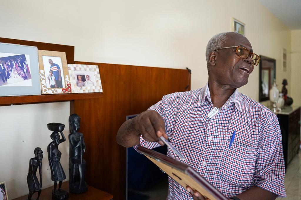 在安哥拉首都羅安達凱蘭巴新城,加斯帕·佩德羅在家中向記者展示照片。