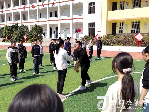 康陽陽老師在體育匯報(bào)課上為學(xué)生講解排球擊球要領(lǐng)