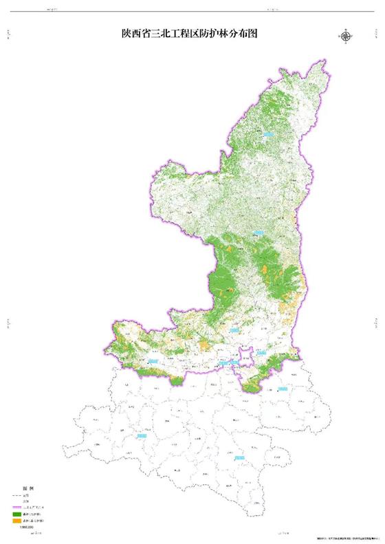 “三北工程”是“防護(hù)林”工程,也是中國(guó)生態(tài)文明建設(shè)的重要標(biāo)志性工程。1978年11月25日,國(guó)務(wù)院批準(zhǔn)實(shí)施三北防護(hù)林體系建設(shè)工程(簡(jiǎn)稱“三北工程”),規(guī)劃期由1978年到2050年,規(guī)劃區(qū)總面積65億畝。“三北工程”是人類最具雄心的生態(tài)工程。陜西是“三北工程”之省,秦嶺以北的黃河流域,包括秦嶺北麓、關(guān)中平原、渭北旱塬、丘陵溝壑、毛烏素沙地,皆是“三北工程”區(qū)。陜西“三北工程”區(qū)總面積1.83億畝,占全省土地面積的59.29%、占全國(guó)“三北工程”區(qū)面積的2.8%。